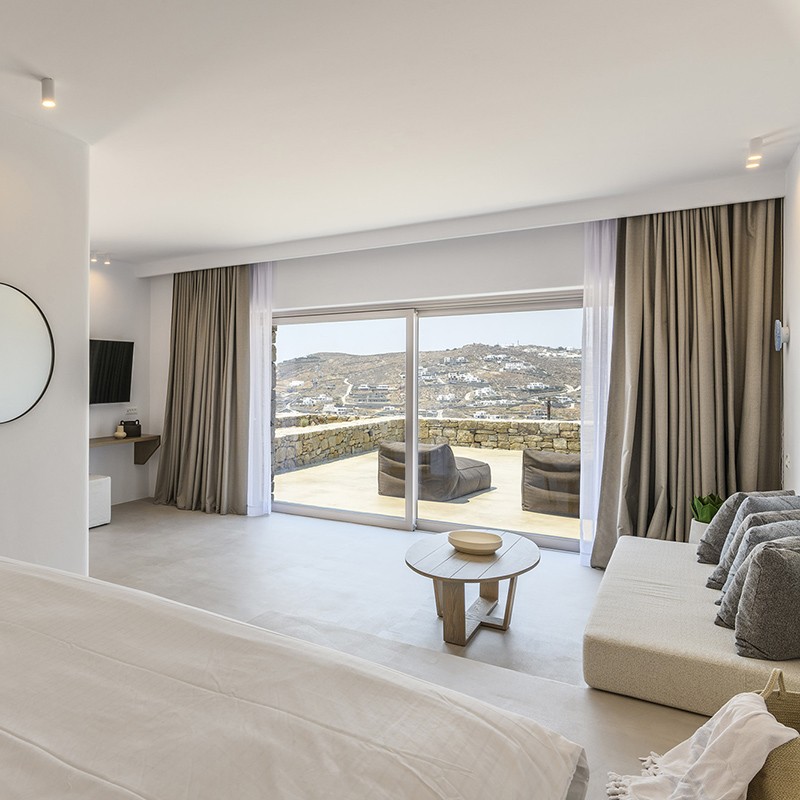 Nestled on the picturesque cosmopolitan area of Ornos and overlooking the turquoise waters of the Aegean, Muro Suites encompasses the authentic Mykonian spirit and welcomes you to a luxurious accommodation experience. Lay back and enjoy absolute serenity and Cycladic bliss from your very own oasis with a private plunge pool by the bay, in a modern suite made of dream fabric. Ample spaces, traditional architecture with modern twists, facilities and amenities elevate comfort and luxury to the highest standards.